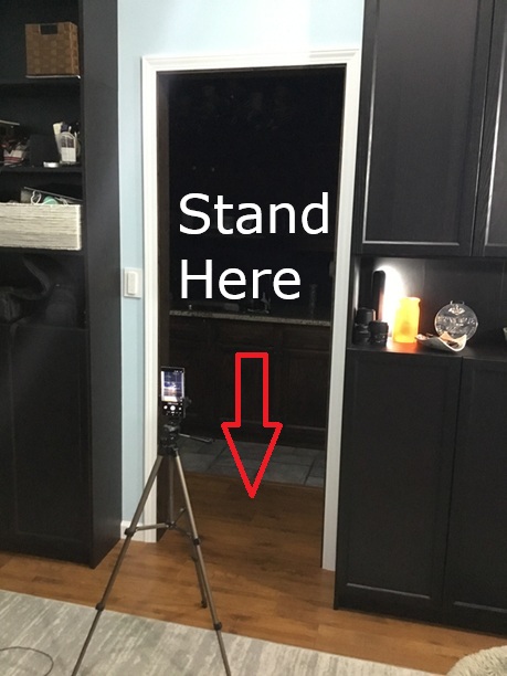 3. Position camera/tripod in the bright space, close enough to you that YOU fill the whole frame and just the edges of the door frame might be visible to the camera (like 4 feet in front of you is about right)